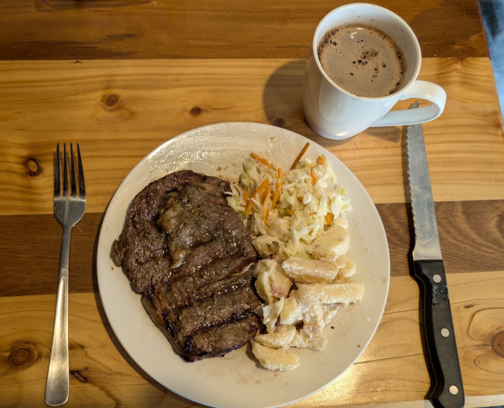 The bar opened before dinner, and Heinrich, Graham and I enjoyed a glass of wine or beer. Dinner was a sit down affair in a large dining room and was a 3-course meal. That morning during check in we were each asked to select from three main menu items: I chose the salmon and Heinrich chose the venison. It was very good.