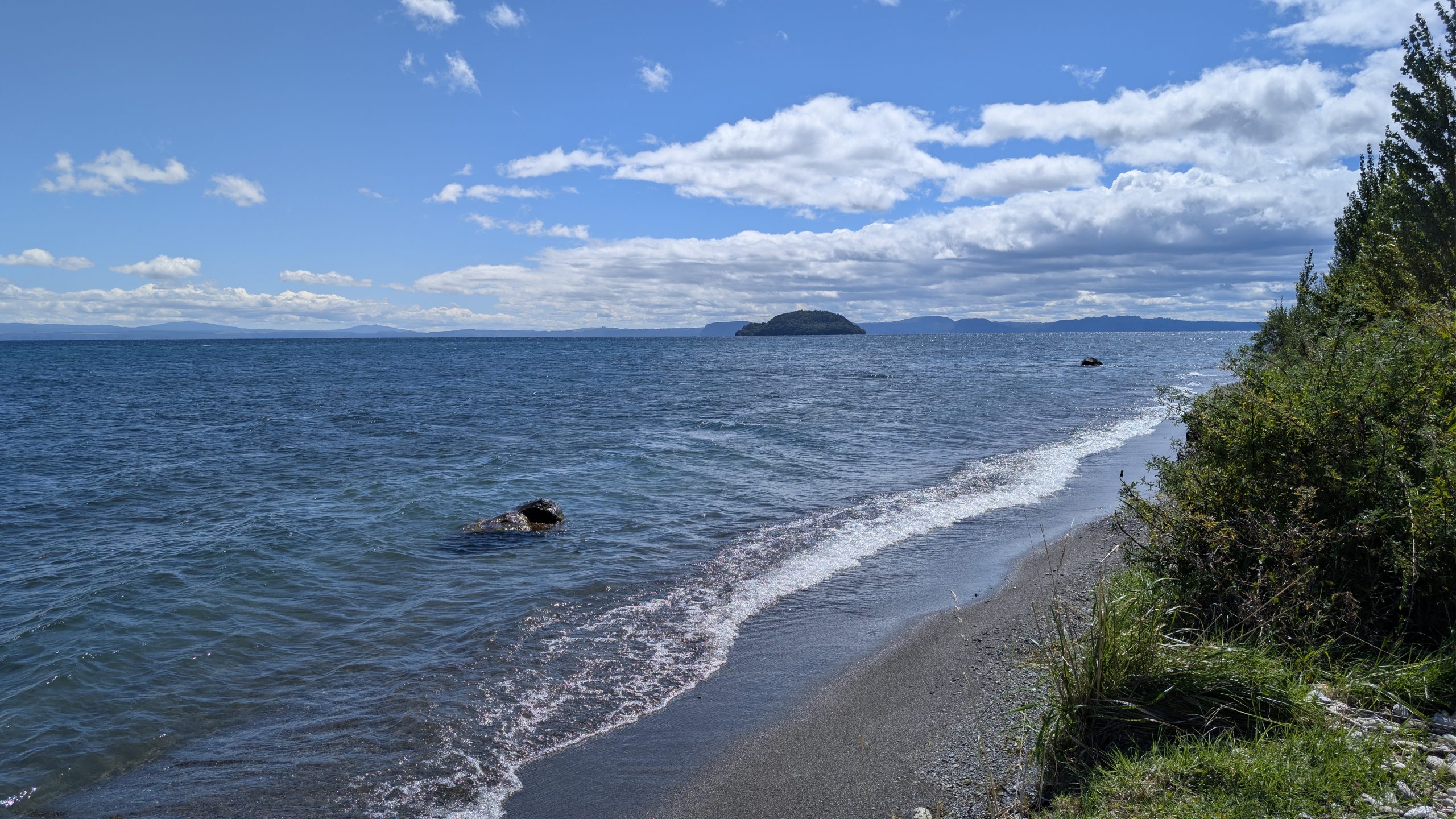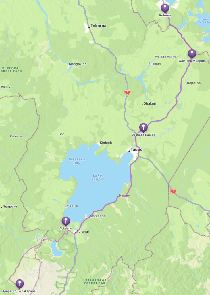 We stopped in Turangi for a gas fill up, and then we continued the drive north, following the shore of Lake Taupo. We stopped at a roadside viewpoint of the lake.