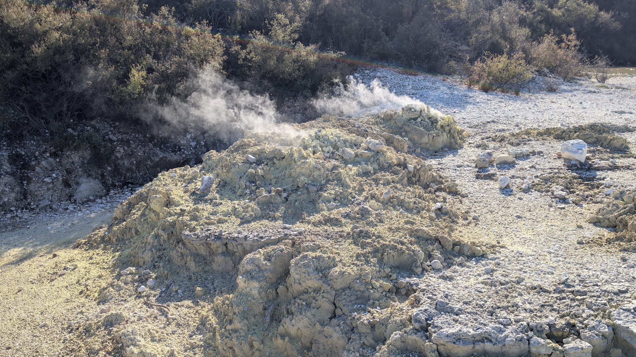 Hoani, which we had seen erupt in 2023, was not overflowing and the water level was down by a meter. The area behind the crater that had been covered with water in 2019 was now dry.