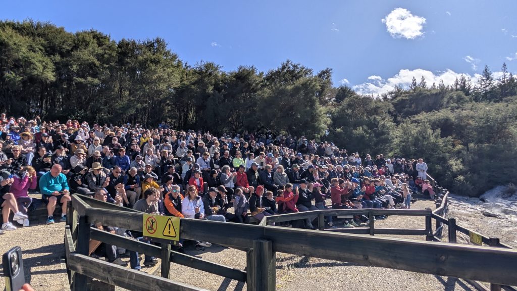 Waiotapu Geyser vent view from the overlookStanding room only crowd at Lady KnoxLady Knox Geyser steaming ligtly after the eruption