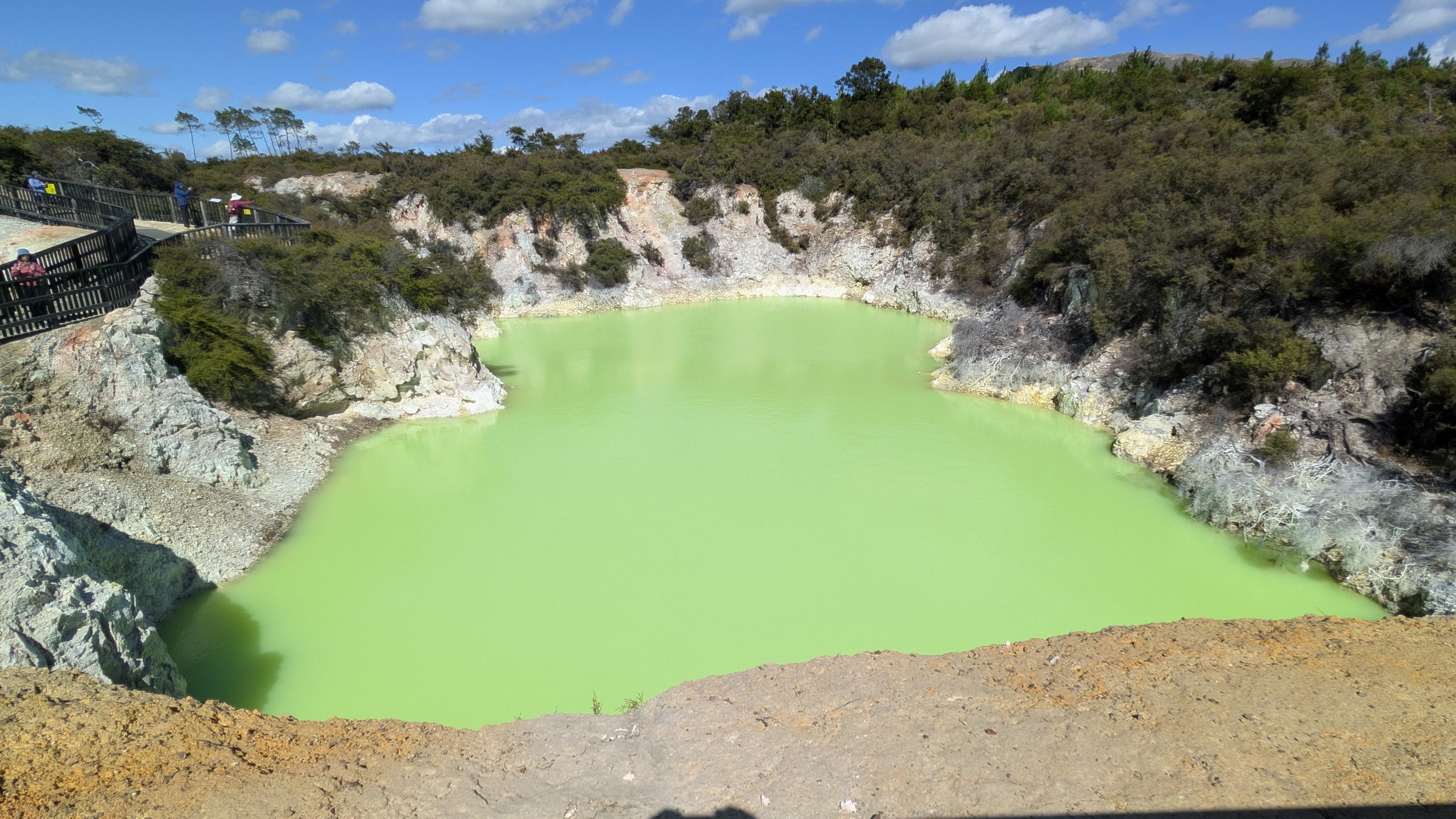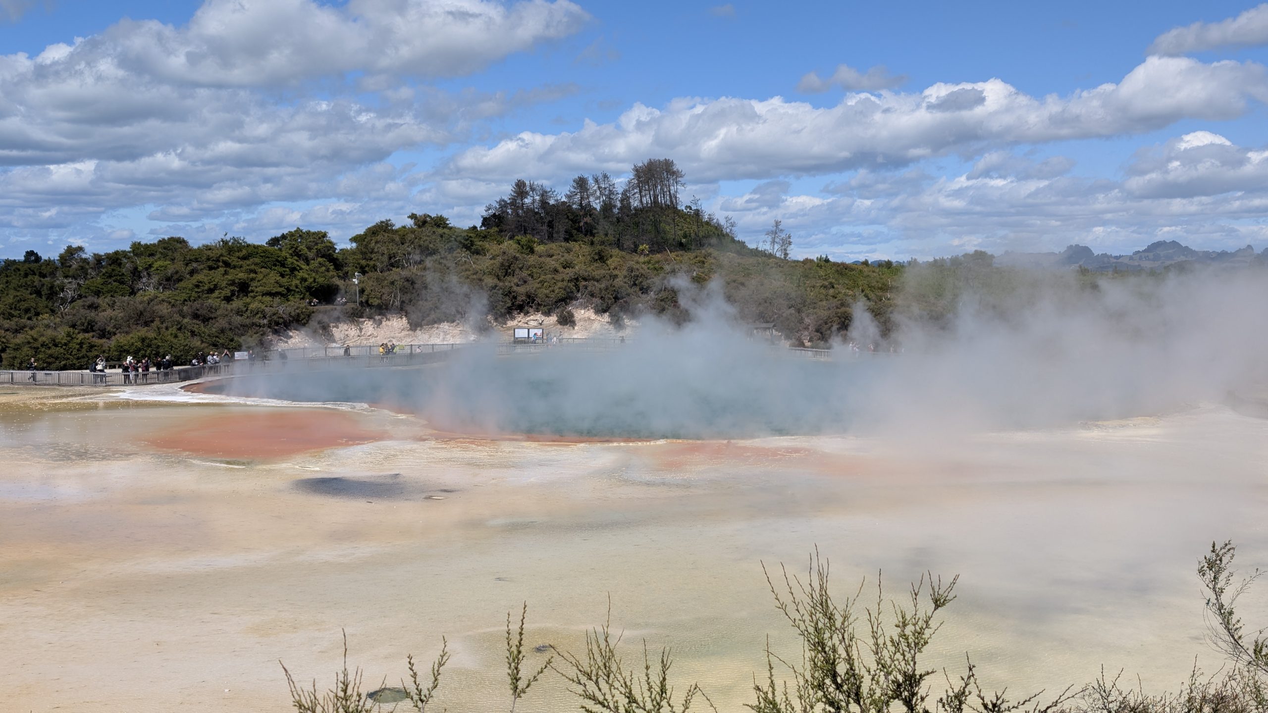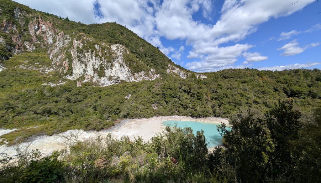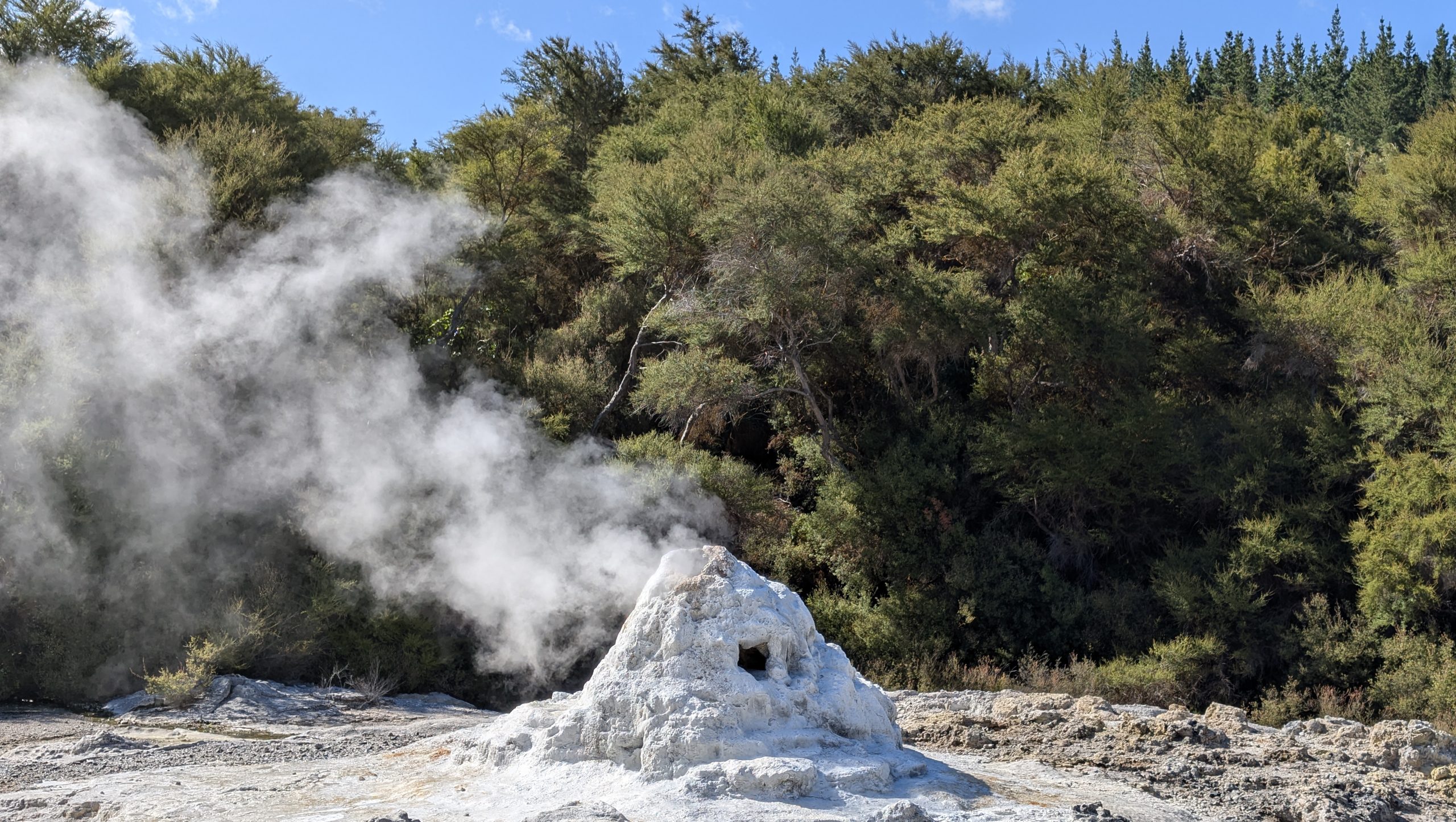 The experience at Lady Knox was underwhelming with the entire geyser eruption lasting only a little over a minute, and the sounds of the eruption were drowned out by the guide singing a song. Also some very rude Germans thought they could stand directly in front of us to watch the geyser, and when we asked them to move, they proceeded to squeeze right next to me on the bench so I had barely enough room to move. And I had a pretty bad view of the geyser for photos since a railing was directly blocking my view of part of the vent. So I will not post a video now but will have a link later when Heinrich uploads his much better video.