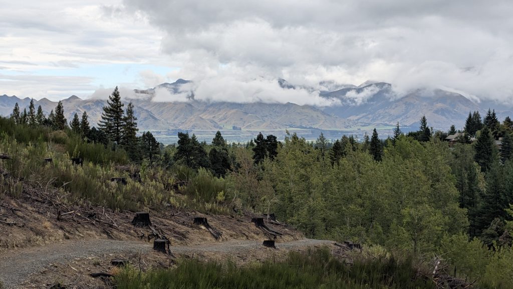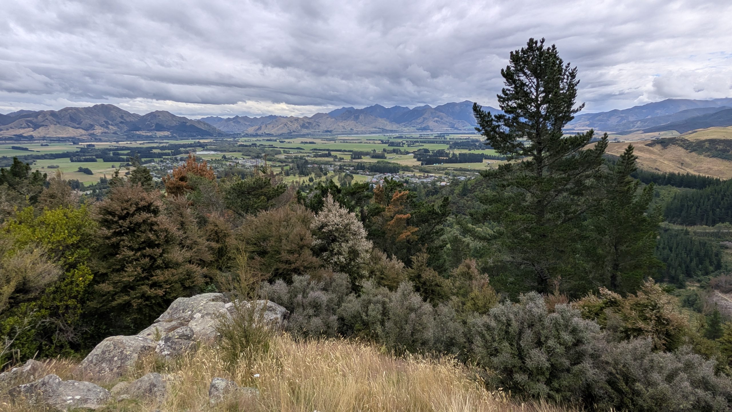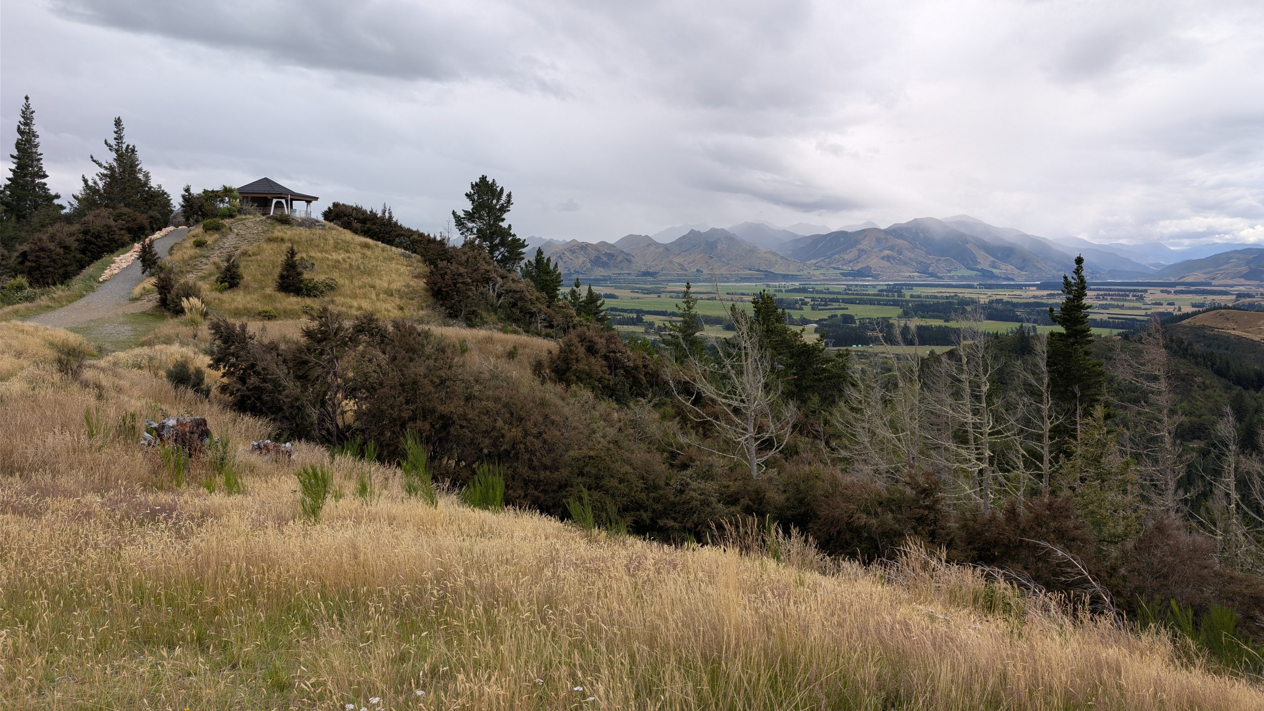 The weather was still dry after lunch, so we drove up the road to hike the Conical Hill Walkway. This was a very popular hike with switchbacks climbing about 500 feet to a lookout with panoramic views of the Hanmer Basin. The hike through the forest was quite nice, although the trail was a bit squishy and muddy from all of the rain. We sat at a picnic table at the top to admire the views.