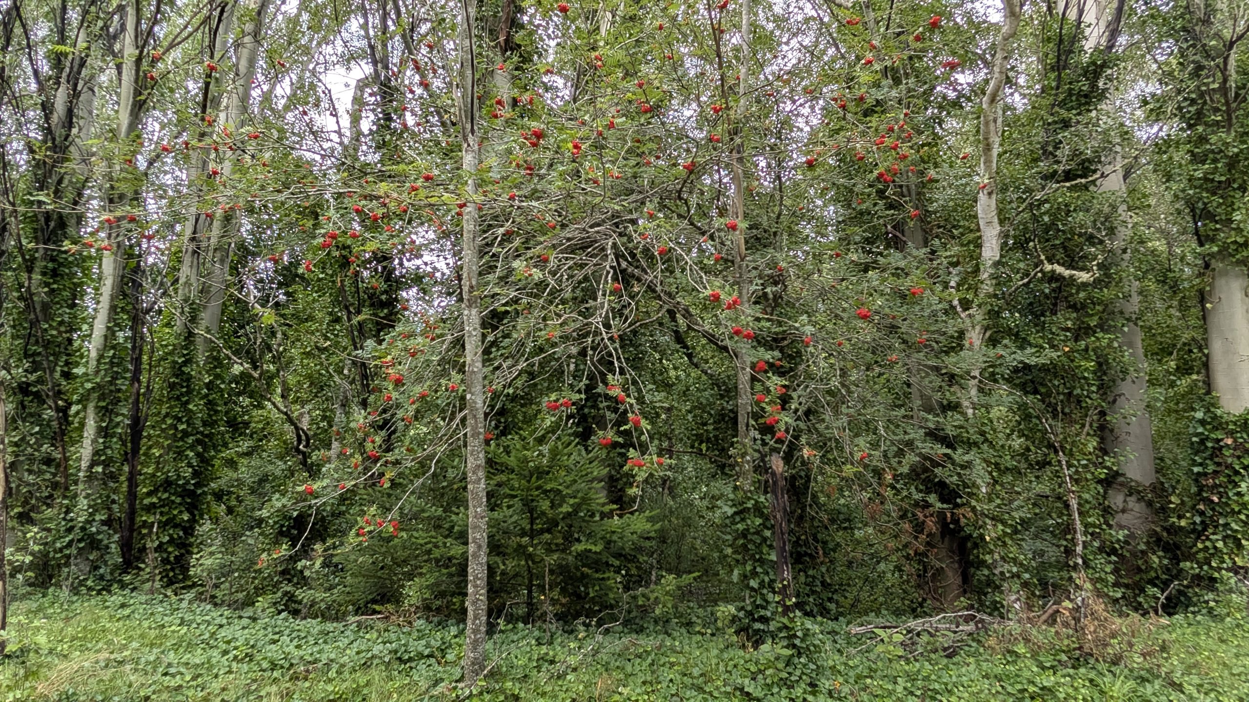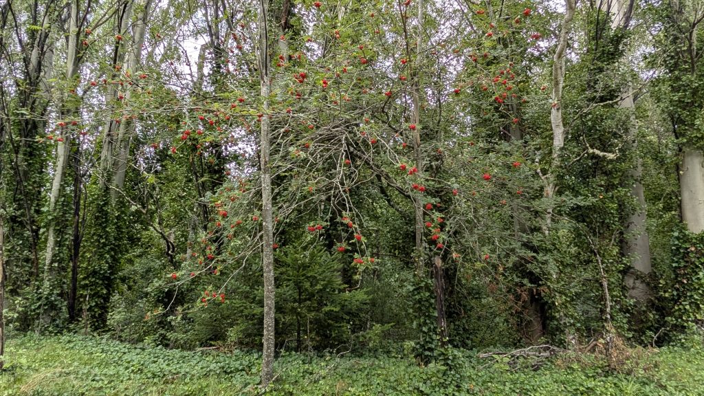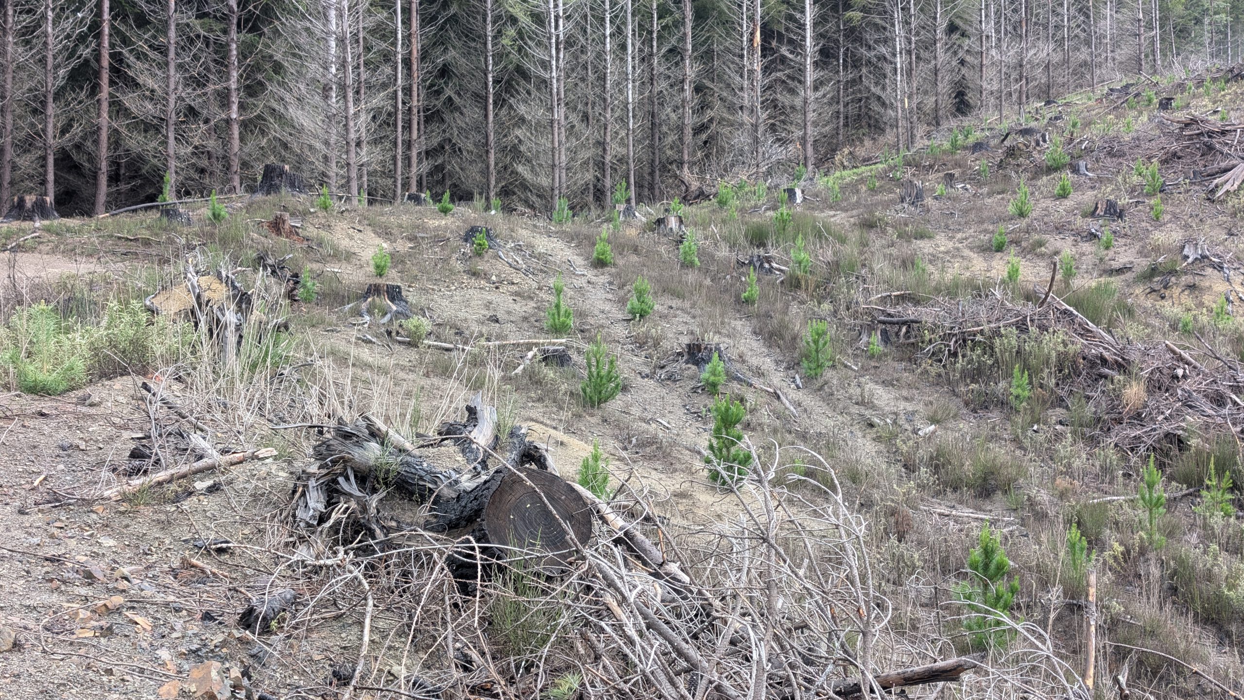 By late morning the rain had stopped and the forecast indicated we should have a few hours of dry weather. So we returned to the Woodland Walk to complete the circuit hike. The area had several trails branching out to various places. One spot that I had wanted to visit was the Dog Stream Waterfall, but the road to the car park was closed, so it was a much longer hike. The map indicated we should be able to hike a connecting trail from the end of the Woodland Walk. So we took the Timberline Trail up through an area where the forest had been heavily clear cut, and it climbed a few hundred feet up a hillside, offering nice views of the village below. But when we reached the top, we found that the trail to the waterfall was roped off. So we hiked down a side road to rejoin the Woodland Walk and returned to the motel.