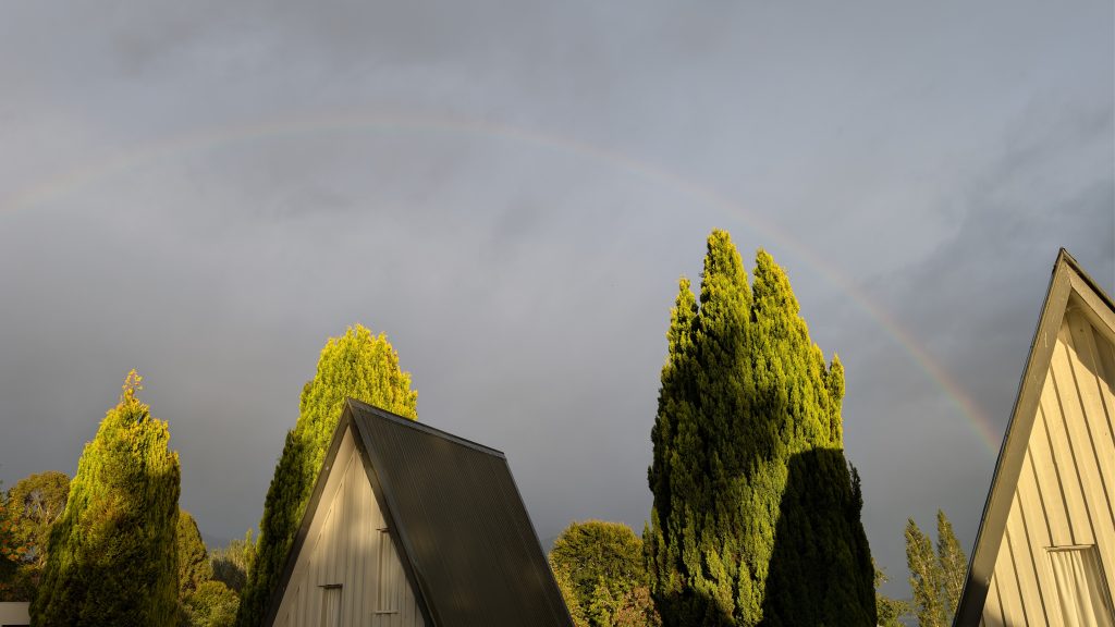 It rained overnight, and we woke up to find mostly gray sky. At one point the clouds parted and we saw a nice rainbow outside of our cabin.
