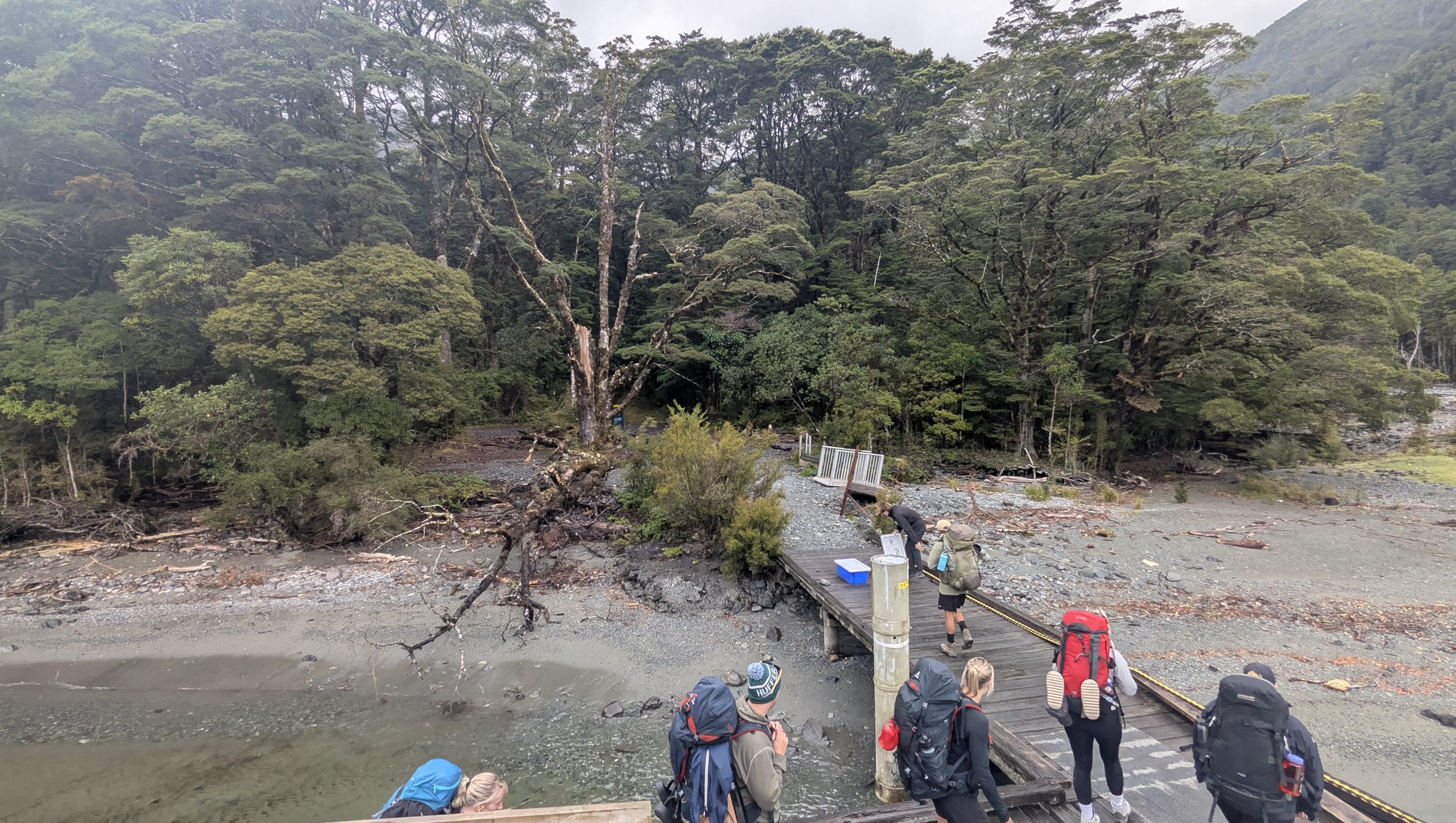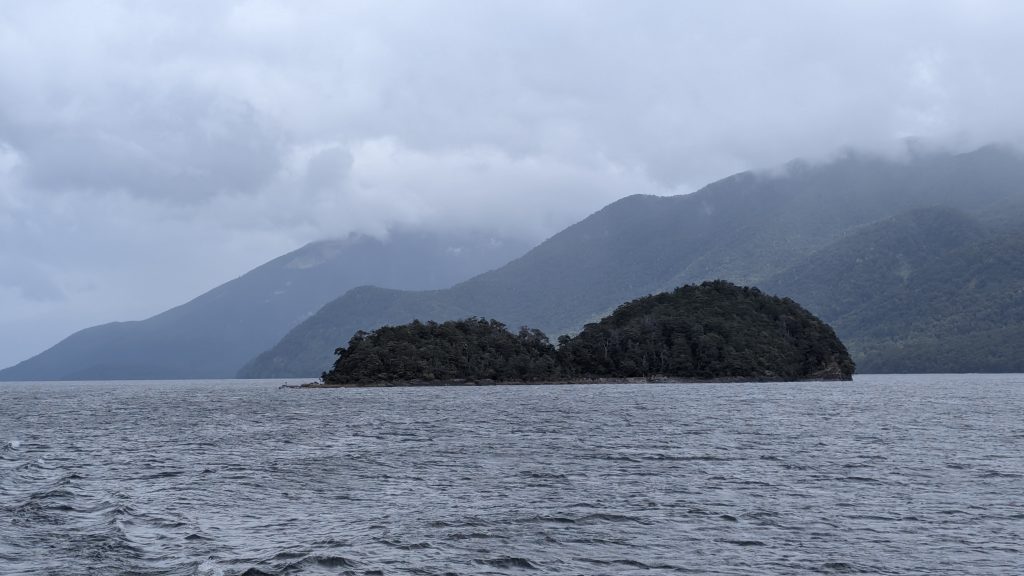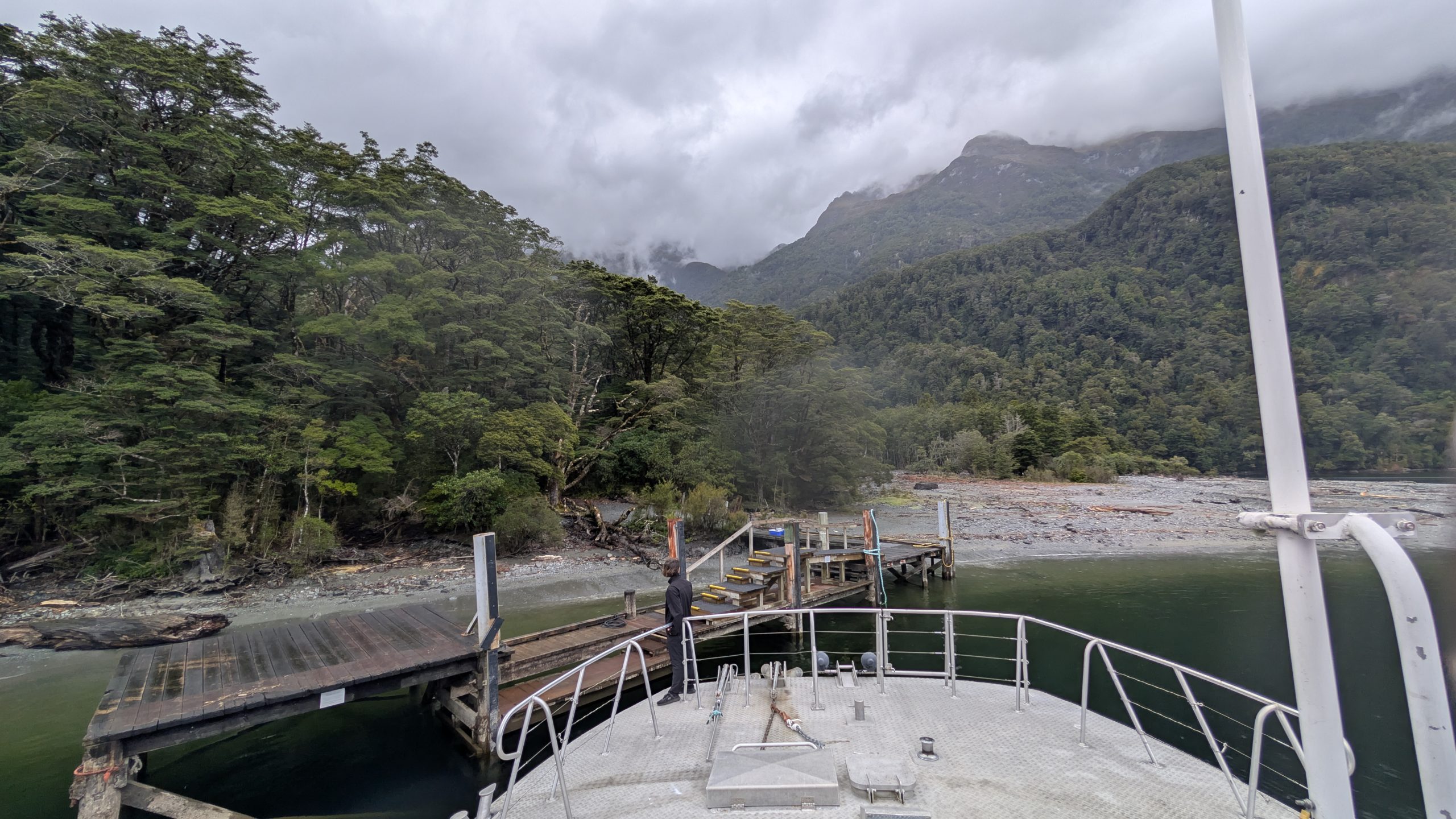 We boarded the bus with our group and drove to the Te Anau Downs boat dock, where we got on the boat to take us across Lake Te Anau to Glade Wharf, the start of the Milford Track. The weather was completely overcast and spitting drops of rain off and on, but that didn't stop us from climbing up to the top deck to get the best views.