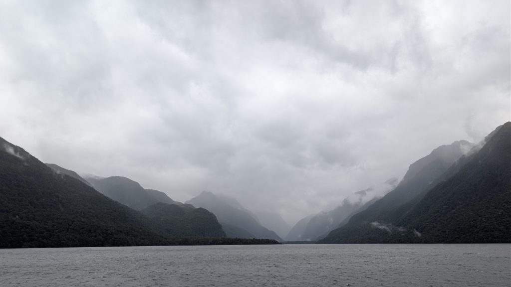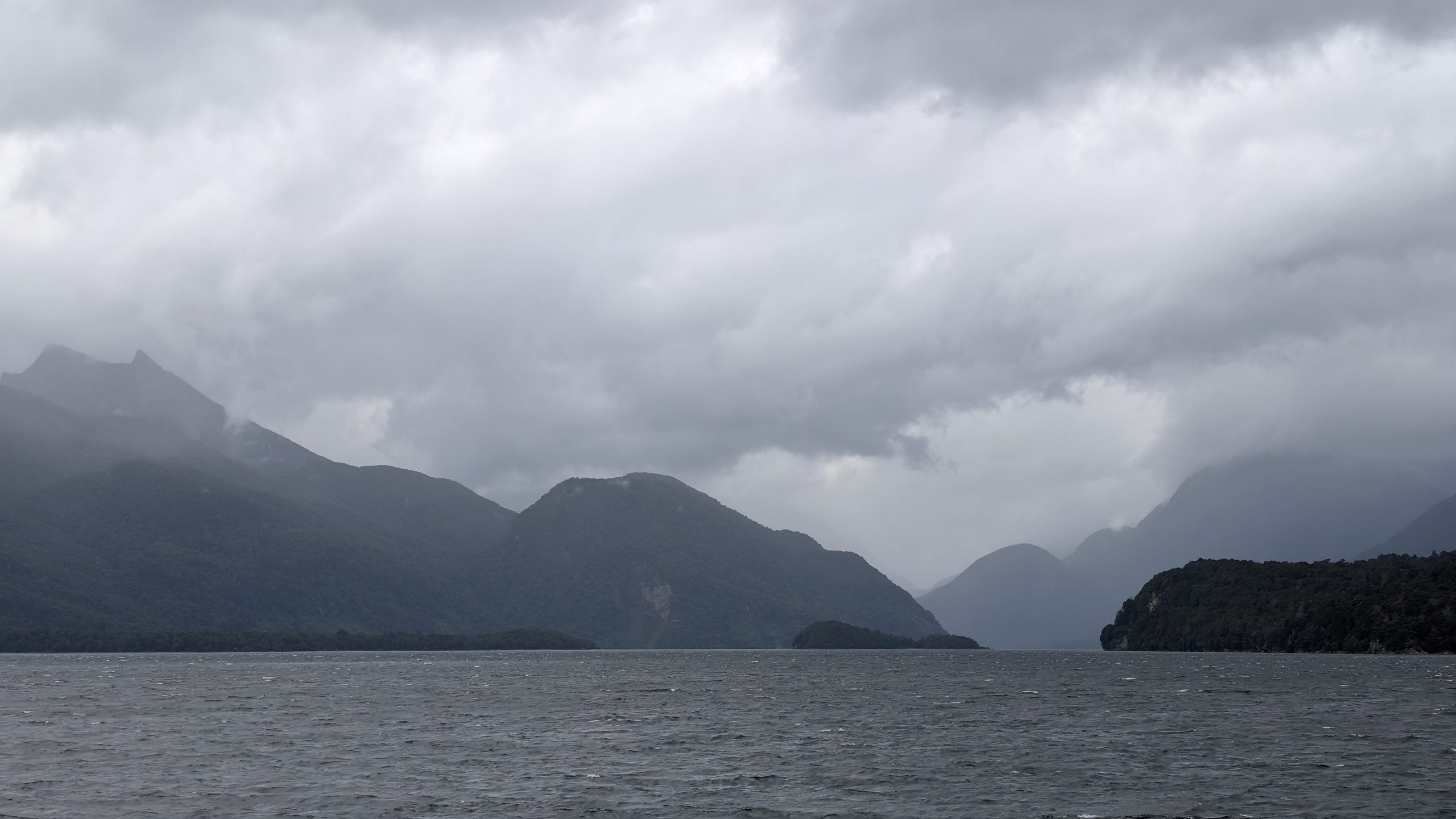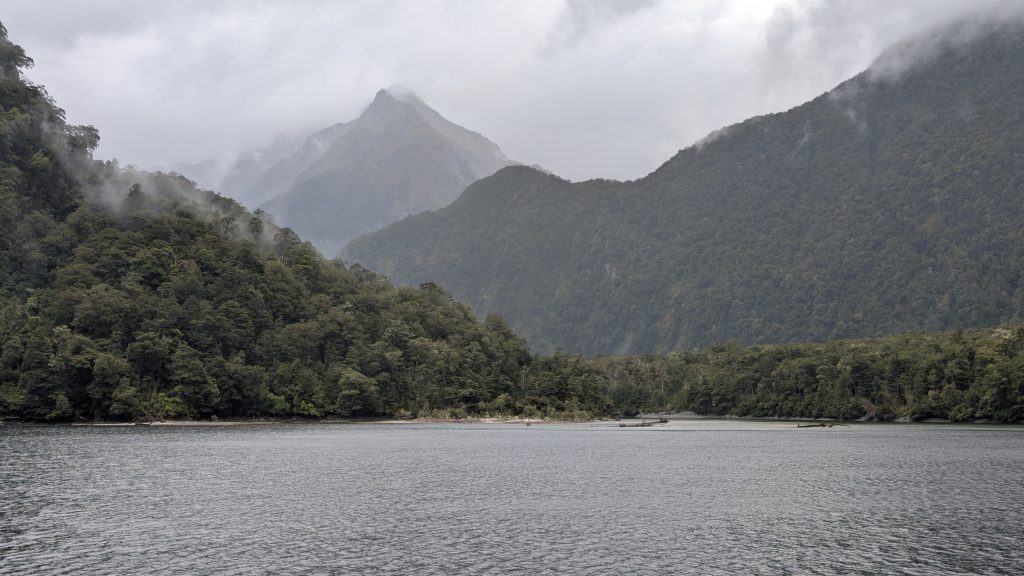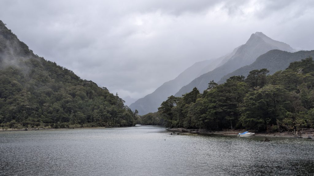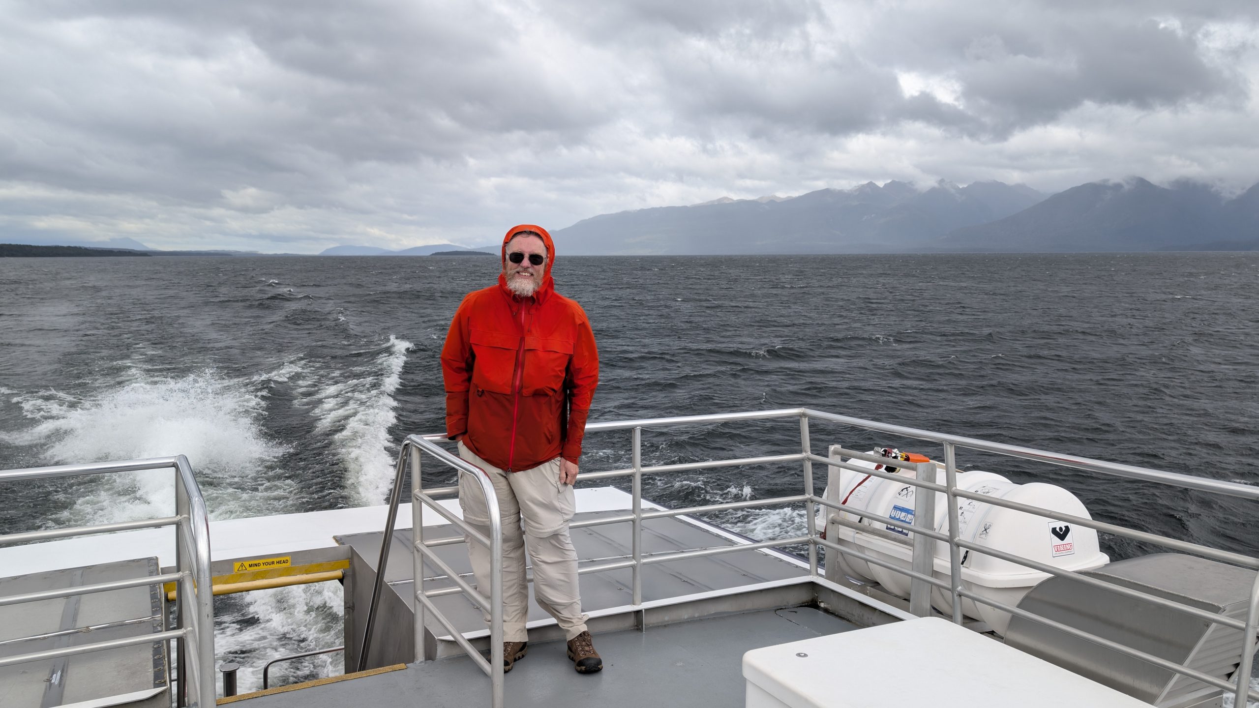 We boarded the bus with our group and drove to the Te Anau Downs boat dock, where we got on the boat to take us across Lake Te Anau to Glade Wharf, the start of the Milford Track. The weather was completely overcast and spitting drops of rain off and on, but that didn't stop us from climbing up to the top deck to get the best views.