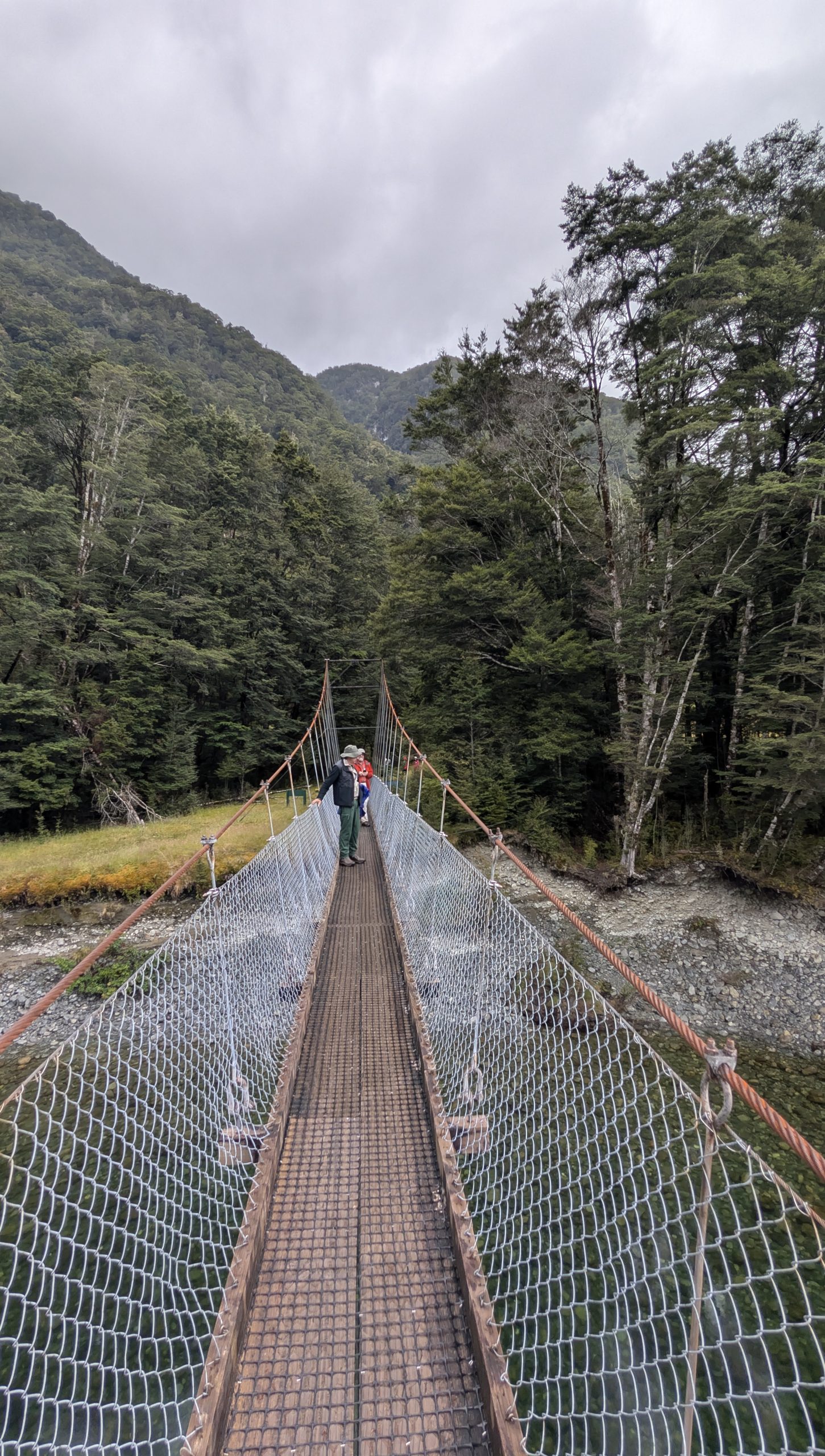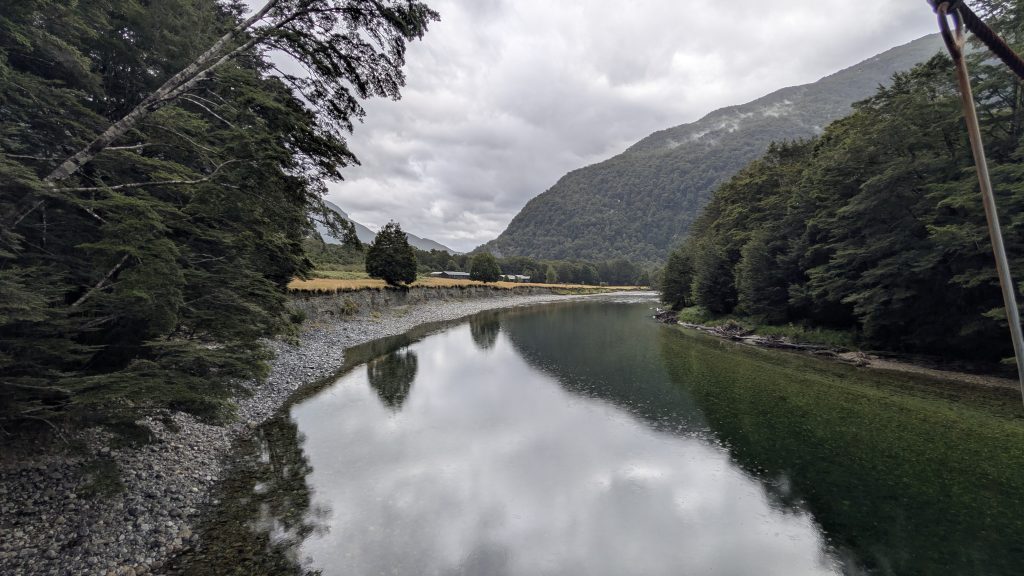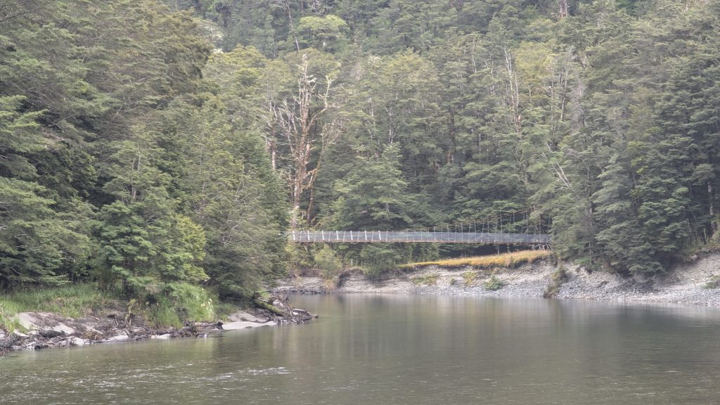 At Glade House, a host checked us in and gave us our assigned rooms. We had just a brief stop to drop our packs in the room, and then we had a 2 km, 1.5-hour nature walk up the Glade Burn. We were split into 3 groups, taking off into different directions since the walk was a loop hike. Before the start of the walk I took a quick photo of the swinging bridge across the Clinton River. We would be traversing it at the start of the hike tomorrow.