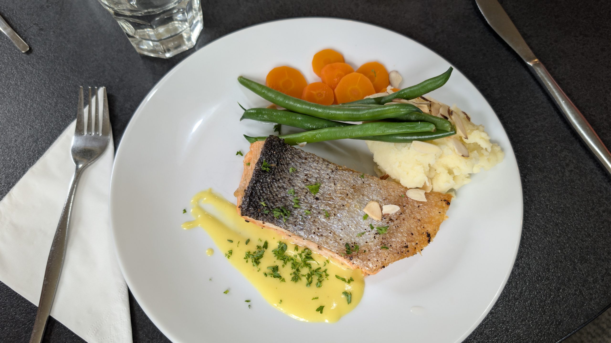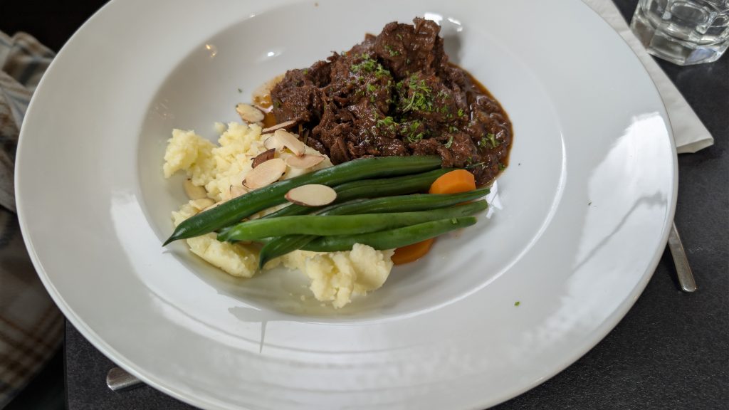 The bar opened before dinner, and Heinrich, Graham and I enjoyed a glass of wine or beer. Dinner was a sit down affair in a large dining room and was a 3-course meal. That morning during check in we were each asked to select from three main menu items: I chose the salmon and Heinrich chose the venison. It was very good.