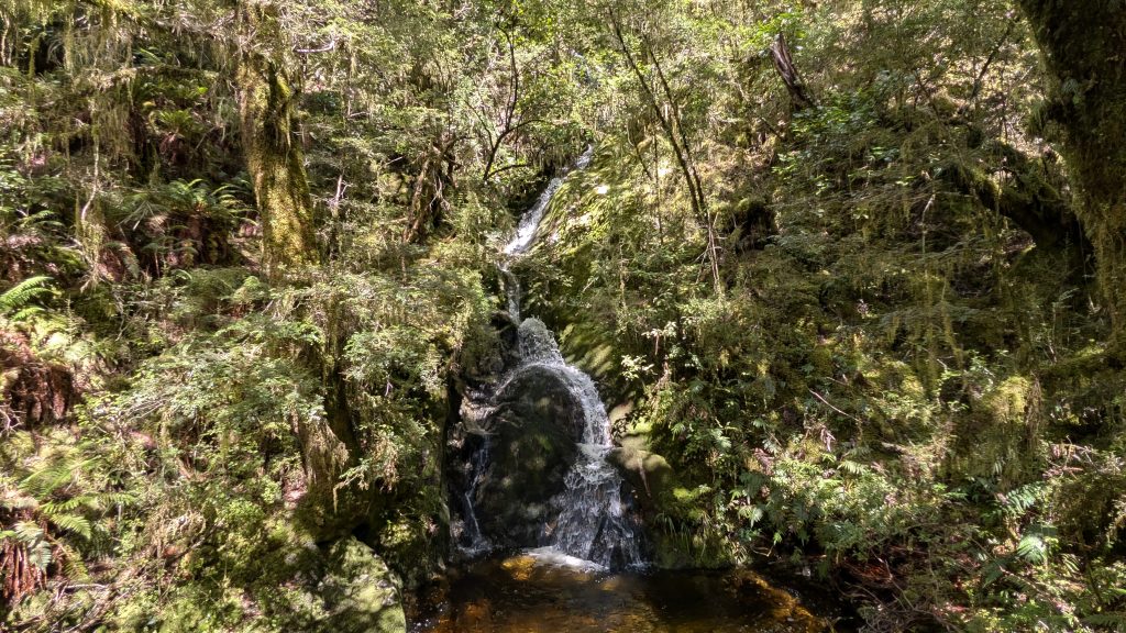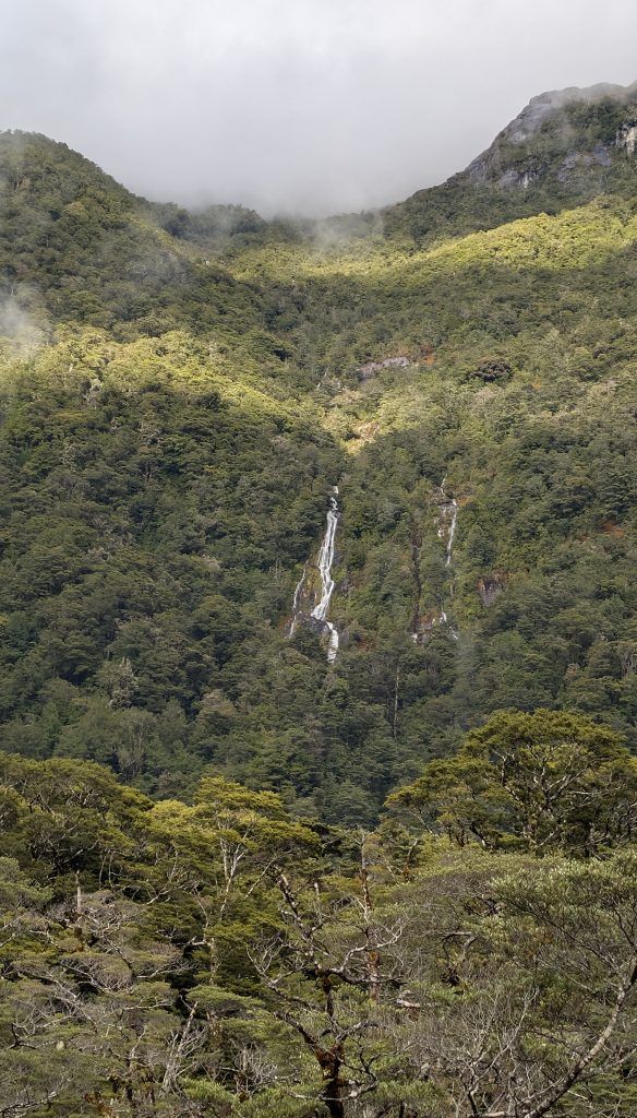 Continuing on the trail, the terrain was more open with grasslands and manuka trees. Waterfalls were everywhere. We took side trips to Hidden Lake and Prairie Lake. The waterfall at Prairie Lake was especially lovely.