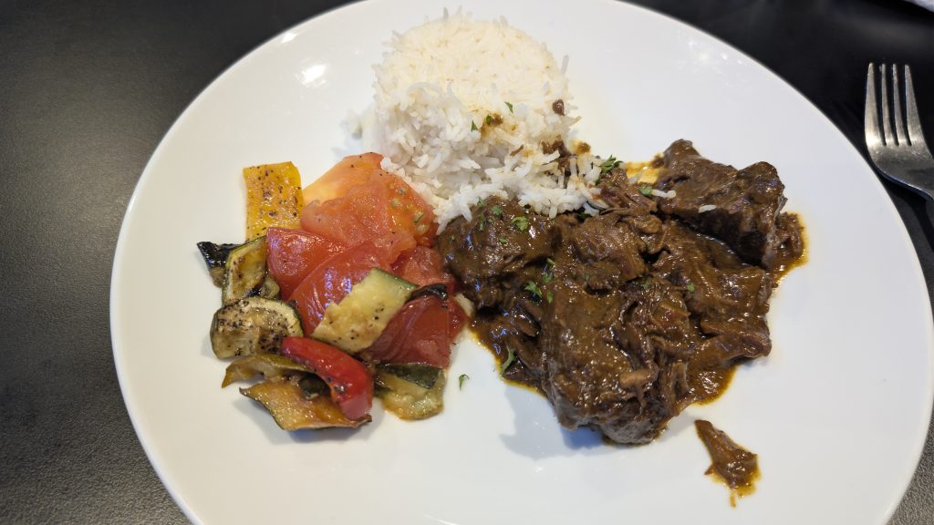 Dinner: slow cooked beef with rice and vegetables