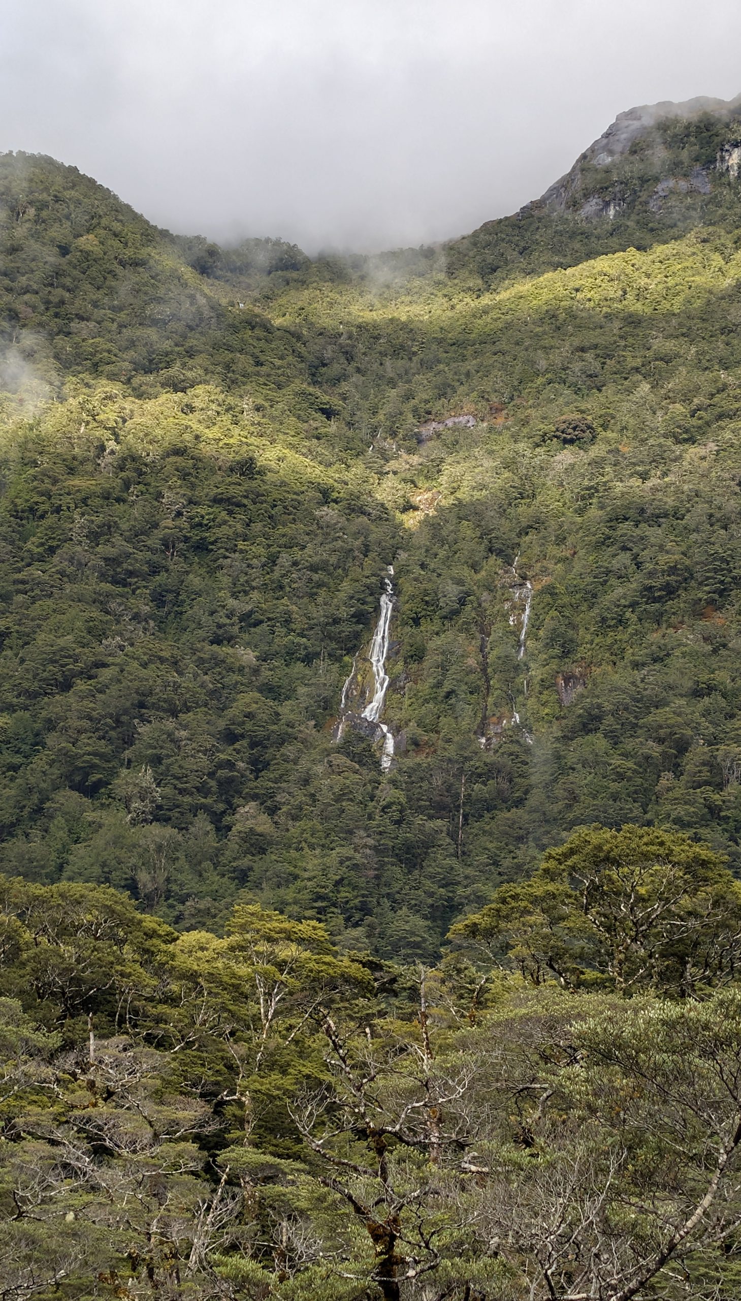 Continuing on the trail, the terrain was more open with grasslands and manuka trees. Waterfalls were everywhere. We took side trips to Hidden Lake and Prairie Lake. The waterfall at Prairie Lake was especially lovely.