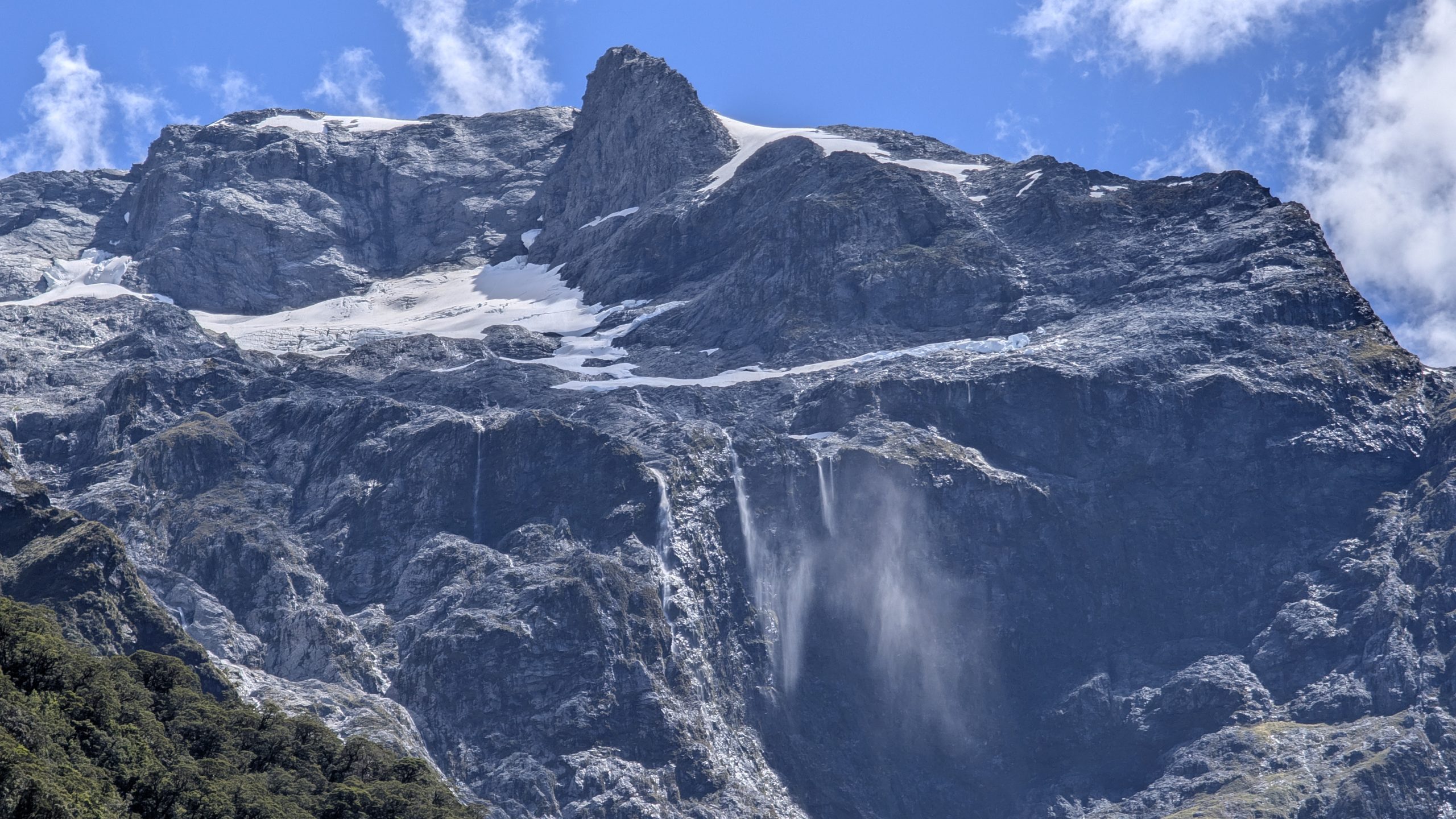 Wind blown waterfalls and snow high up on the peak
