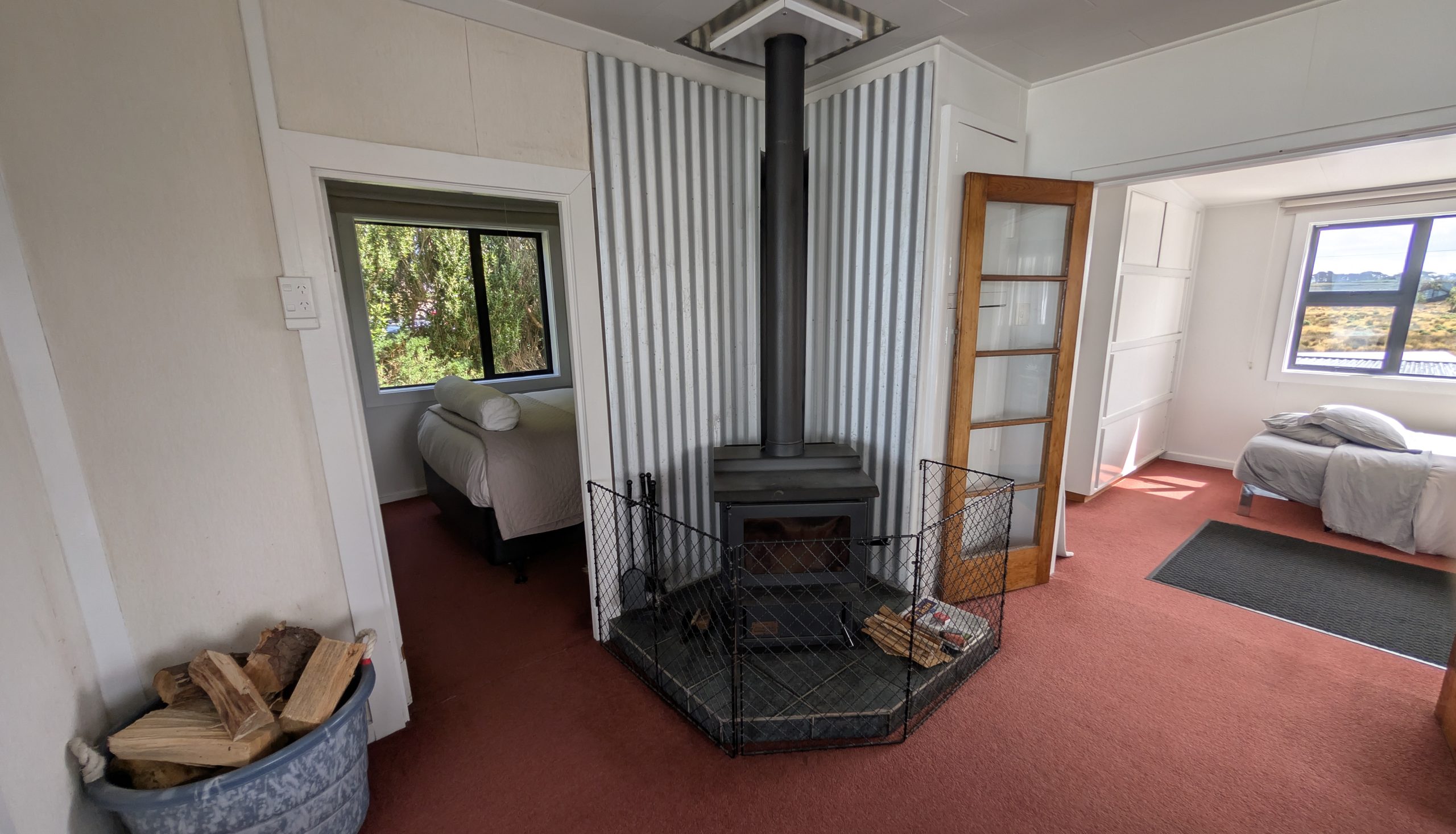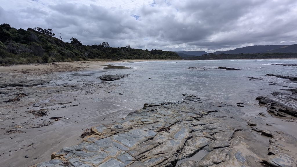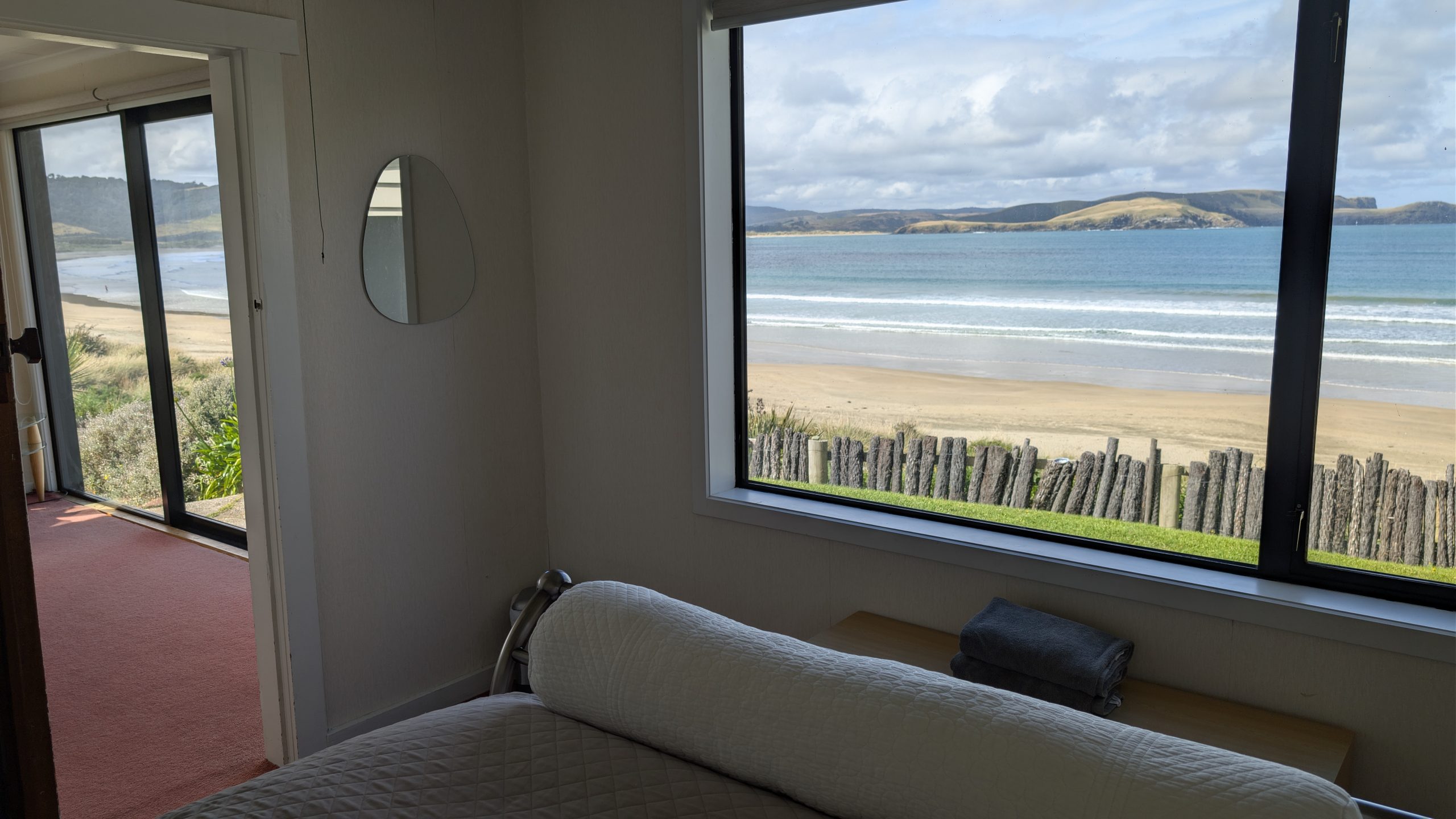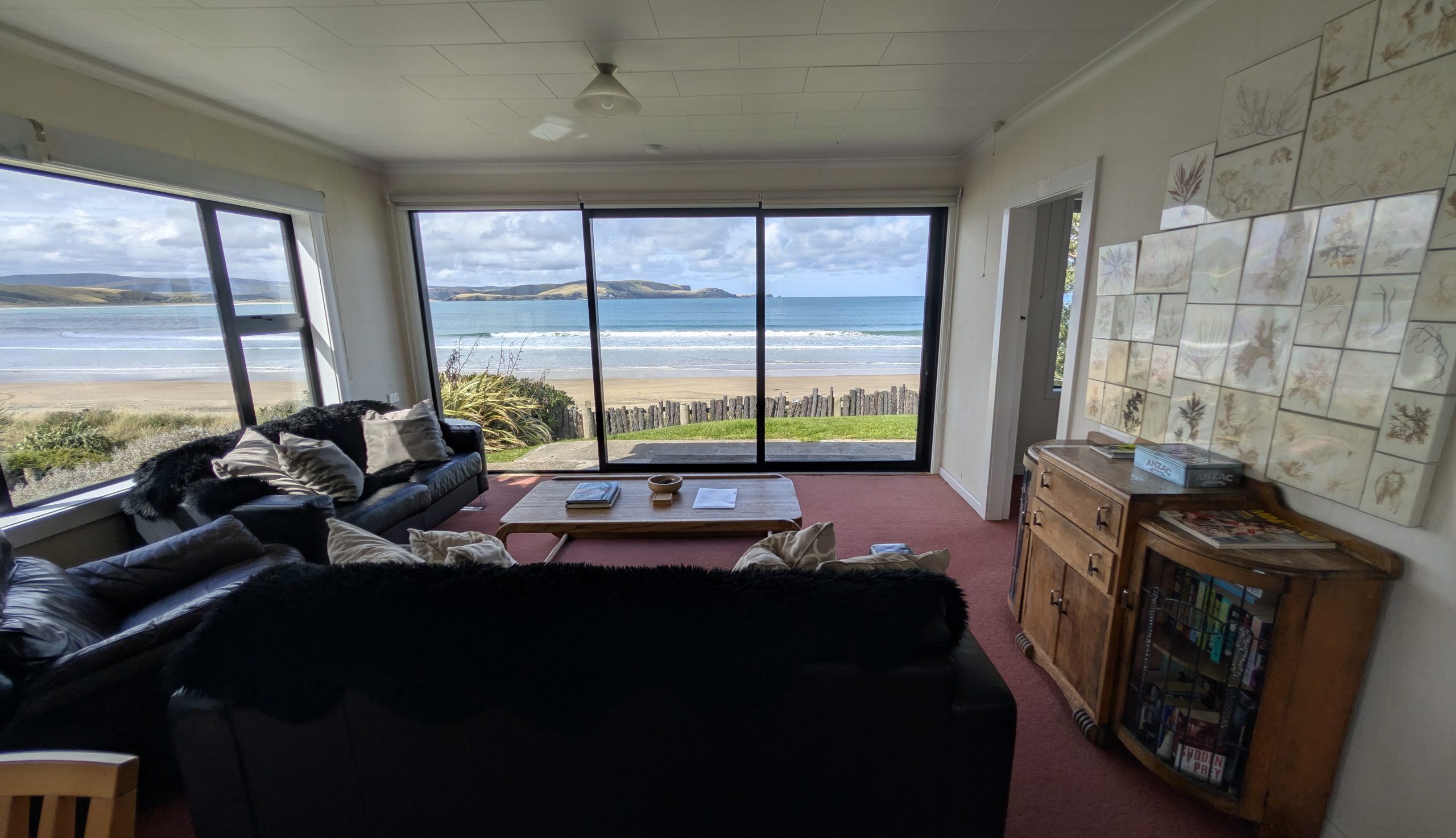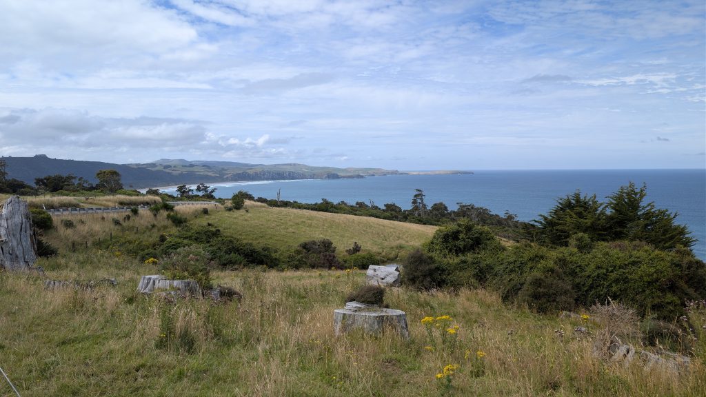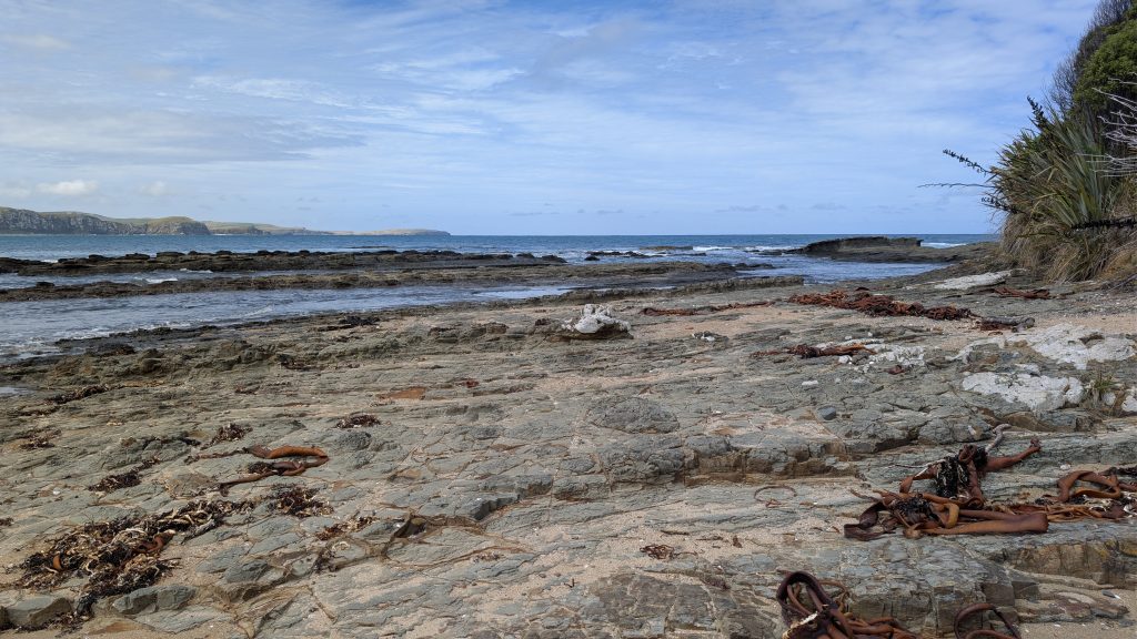 We arrived at Curio Bay and checked into our accommodation for the next two nights: the Cloud 9 vacation rental. We had stayed here before in 2019 and loved it. It has sweeping views of Porpoise Bay from the kitchen, living room, and bedroom. It is also the place where little blue penguins nest underneath the house, and we heard their loud calls in the middle of the night in 2023. We were hoping to hear them and possibly see them again.