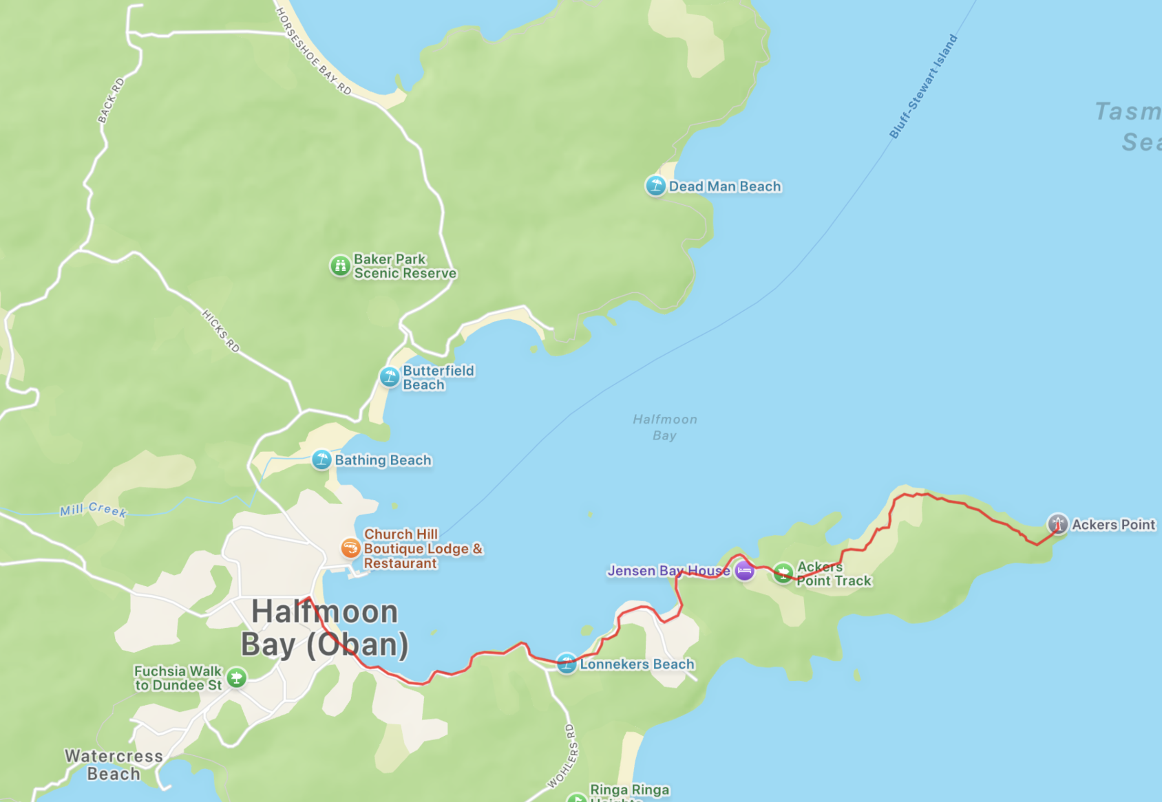 We walked back to our room and had lunch. Heinrich was done walking for the day, but I wanted to see more, so in the afternoon I decided to hike to Horseshoe Point which was southeast of Oban and had views of the Foveaux Strait and Horseshoe Bay.