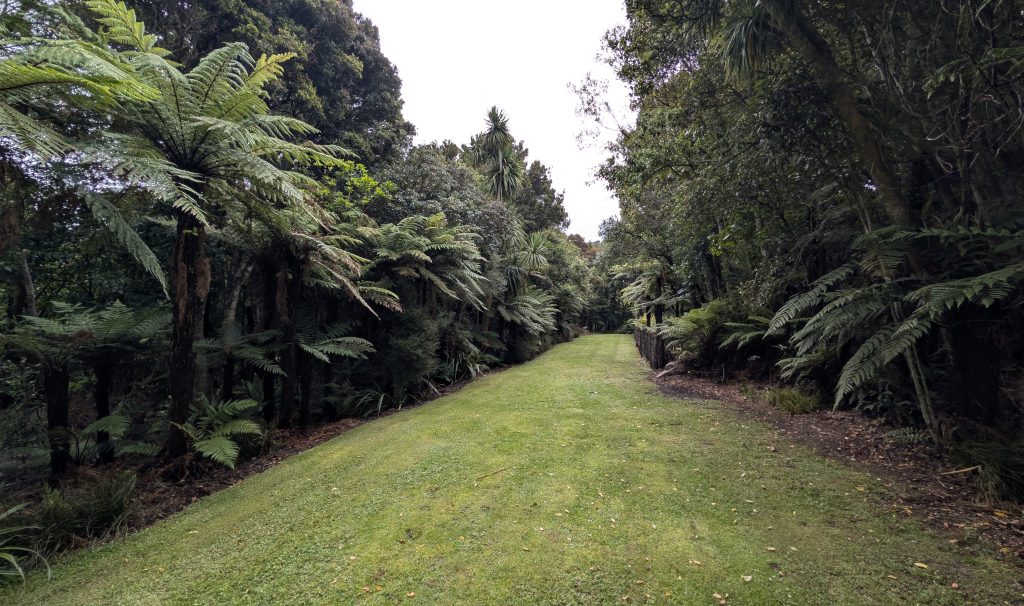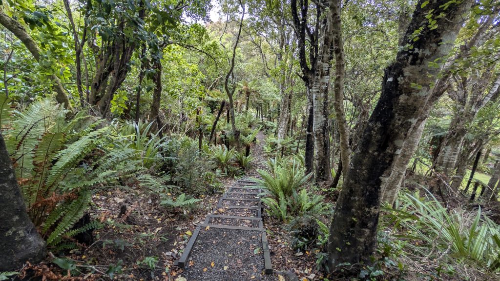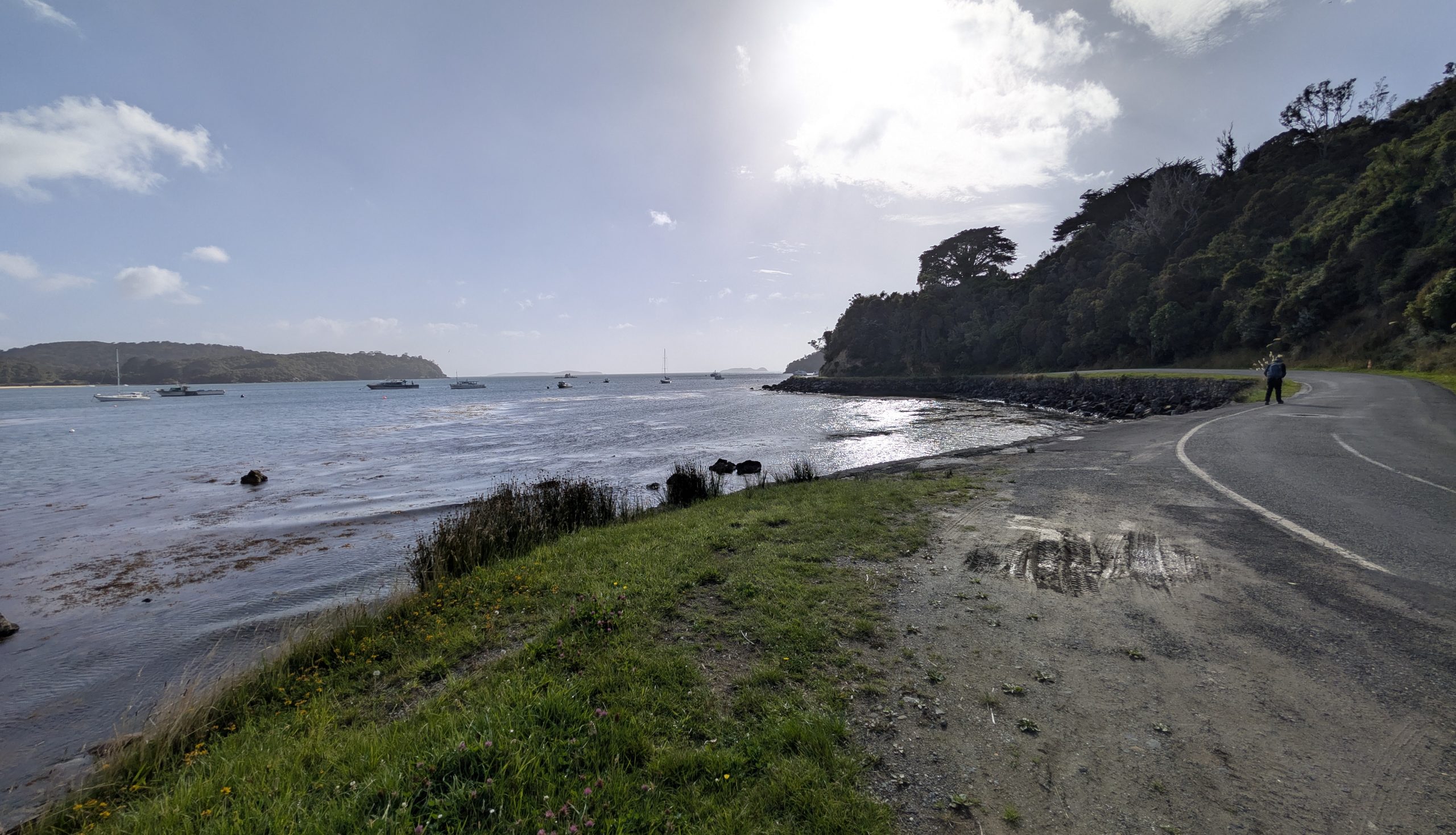 Past Butterfield Beach I walked up Bragg Bay Road, which was a gravel road. I stopped to see the Moturau Moana Native Gardens. I climbed a short trail to a nice viewpoint of Halfmoon Bay.