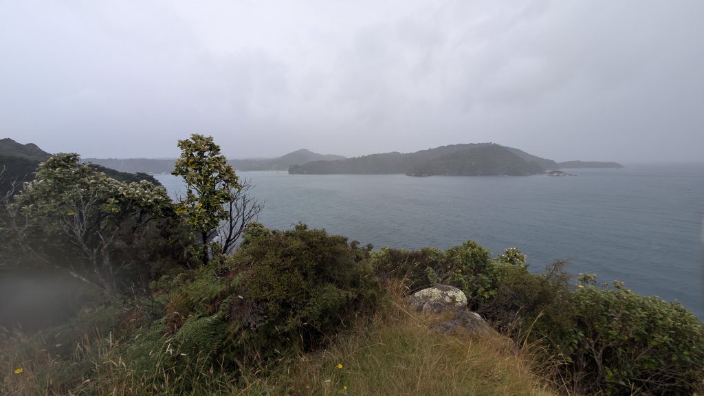 The road ended at Ackers Stone House which we would explore later on our return. We took the hiking trail that climbed up to Ackers Point. The weather had been sunny for the start of our walk but then steadily got cloudier, and by the time we reached Ackers Point it was completely cloudy and appeared to be raining in the distance. We could see many of the islands in the Foveaux Strait.