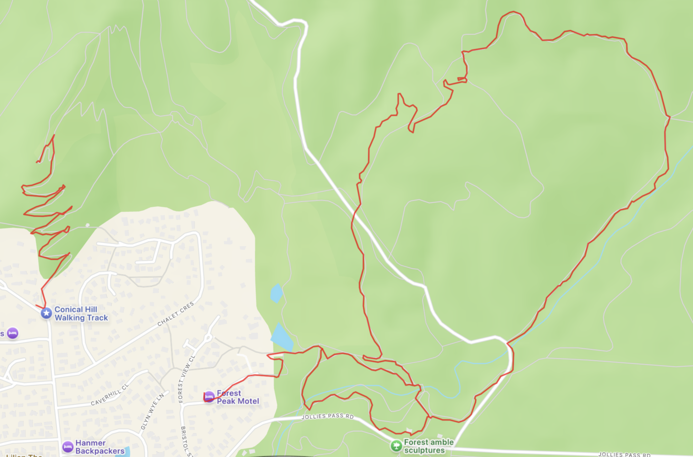 By late morning the rain had stopped and the forecast indicated we should have a few hours of dry weather. So we returned to the Woodland Walk to complete the circuit hike. The area had several trails branching out to various places. One spot that I had wanted to visit was the Dog Stream Waterfall, but the road to the car park was closed, so it was a much longer hike. The map indicated we should be able to hike a connecting trail from the end of the Woodland Walk. So we took the Timberline Trail up through an area where the forest had been heavily clear cut, and it climbed a few hundred feet up a hillside, offering nice views of the village below. But when we reached the top, we found that the trail to the waterfall was roped off. So we hiked down a side road to rejoin the Woodland Walk and returned to the motel.